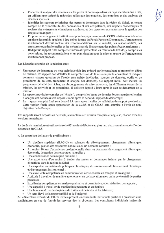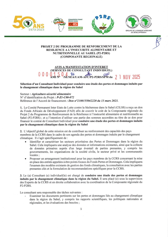 1. Le Comité Permanent Inter Etats de Lutte contre la Sècheresse dans le Sahel (CILSS) a reçu un don du Fonds Africain de Développement (FAD) afin de couvrir le coût de la Composante régionale du Projet 2 du Programme de Renforcement de la Résilience à l’insécurité alimentaire et nutritionnelle au Sahel (P2-P2RS) ; et a l’intention d’utiliser une partie des sommes accordées au titre de ce don pour financer le contrat de Consultant Individuel pour conduire une étude des pertes et dommages induits par le changement climatique dans la région du Sahel