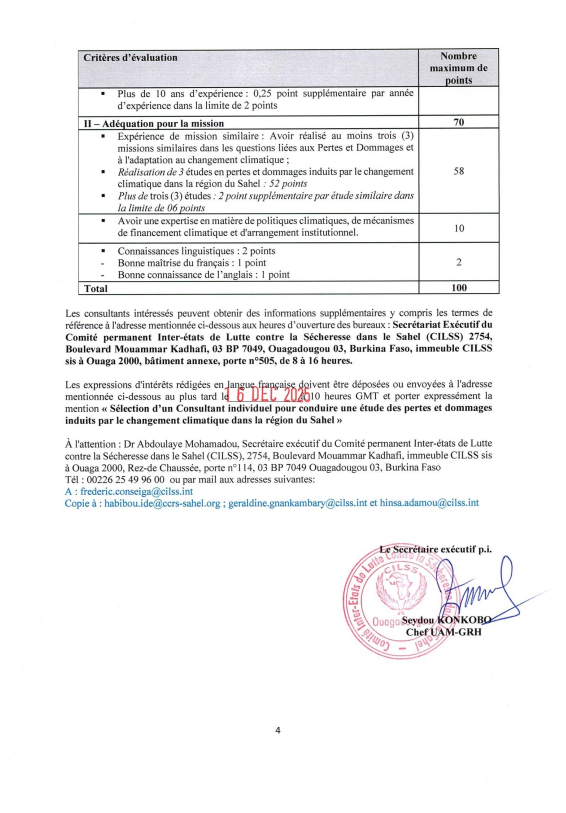 Les expressions d’intérêts rédigées en langue française doivent être déposées ou envoyées à l’adresse mentionnée ci-dessous au plus tard le 16 décembre 2025 à 10 heures GMT et porter expressément la mention « Sélection d’un Consultant individuel pour conduire une étude des pertes et dommages induits par le changement climatique dans la région du Sahel »